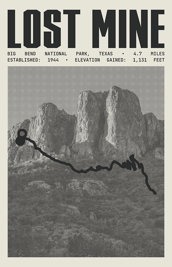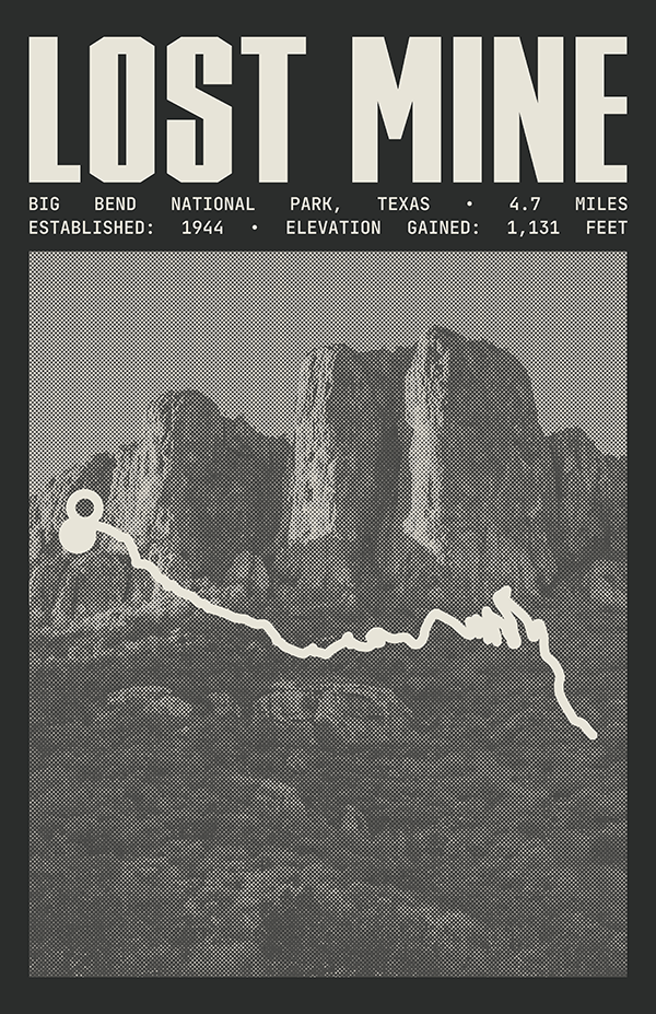 The Lost Mine Trail Poster Art, provided by park-poster, typically captures the essence of this iconic Big Bend National Park hike through a stunning visual representation. These posters often feature vibrant and bold colors that evoke the breathtaking landscapes of the Chisos Mountains and the surrounding desert. The artwork might highlight the trail’s winding path, the towering cliffs, and the expansive views from the summit, all while showcasing the rich natural beauty and rugged terrain that make the Lost Mine Trail so memorable. These posters not only serve as a tribute to the trail’s scenic splendor but also reflect the spirit of adventure and exploration that draws visitors to Big Bend National Park. The art is designed to inspire both those who have hiked the trail and those who dream of experiencing it in the future.