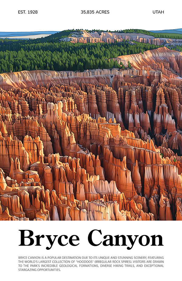 Bryce Canyon National Park offers a unique adventure with iconic hikes showcasing its otherworldly landscapes. The Fairyland Loop invites solitude among hoodoos, while the Navajo Loop provides up-close views of the canyon’s formations. For a challenge, the Peekaboo Loop delivers panoramic vistas, and the Queens Garden Loop offers vibrant colors and intricate rock shapes. The Mossy Cave Trail features cascading waters in a desert grotto, and the Turret Arch offers a stunning photographic backdrop at sunrise or sunset. Park-Poster captures the beauty of Bryce Canyon with quality prints, bringing these remarkable vistas into your space.