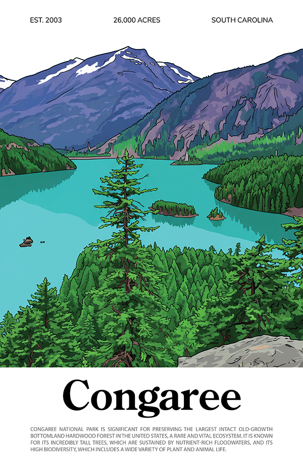 The Congaree National Park poster collection celebrates one of the most ecologically rich and tranquil landscapes in the U.S. Each piece highlights the park’s lush, swampy beauty, where towering trees, winding rivers, and diverse wildlife thrive.
