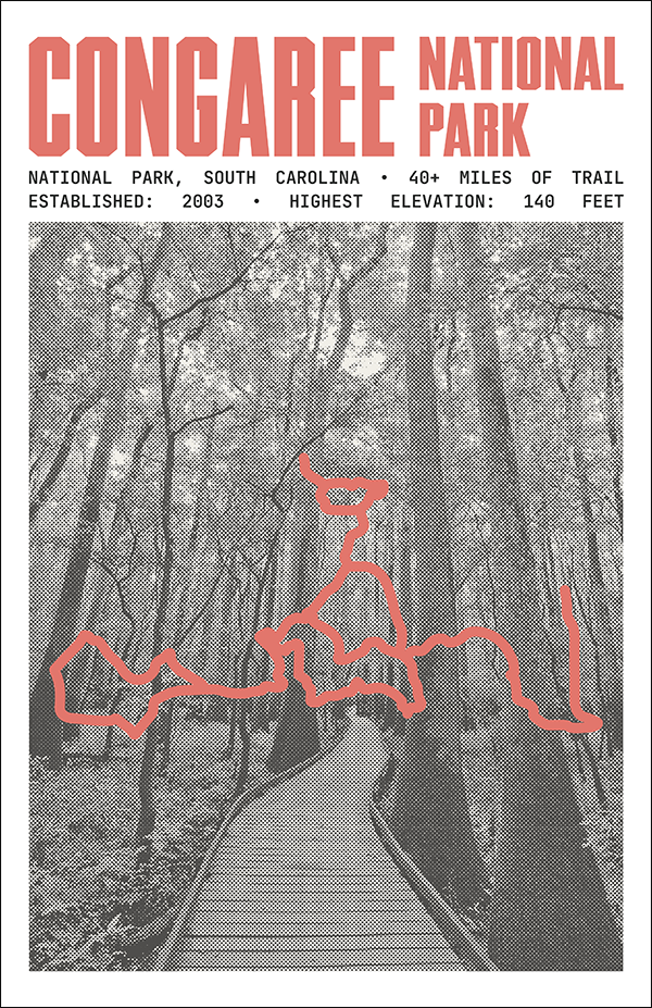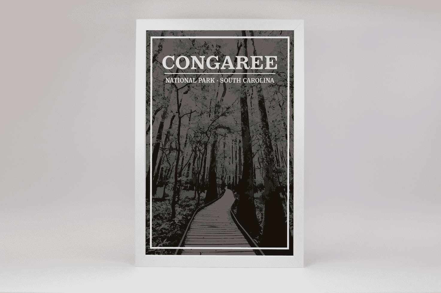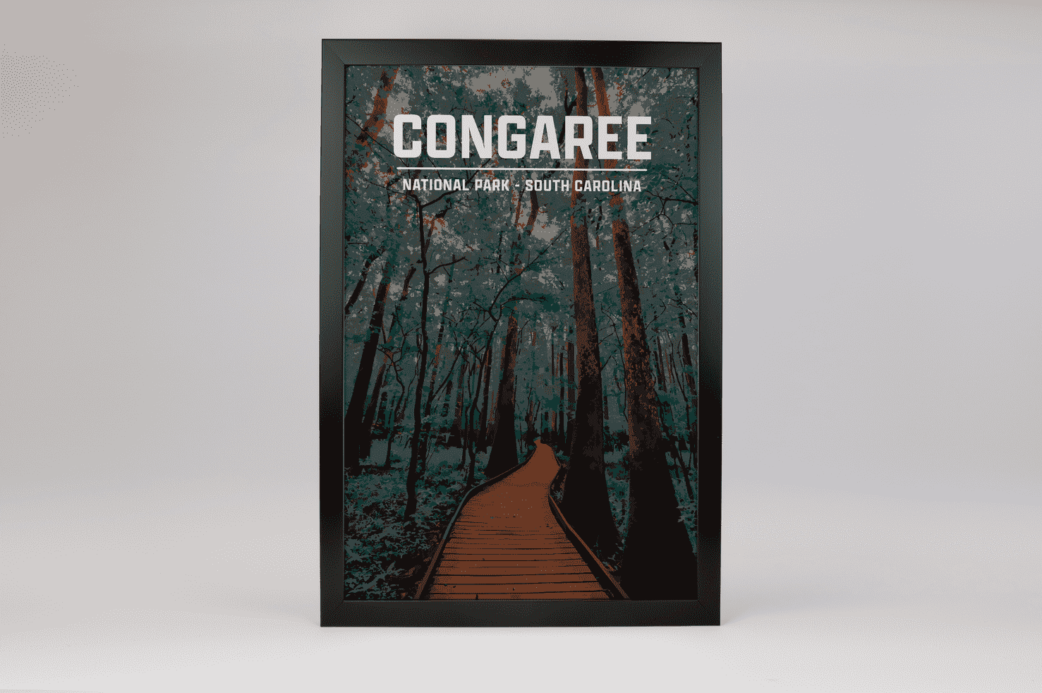 Celebrate the beauty of Congaree National Park with this vintage-inspired print, perfect for nature lovers and adventurers. This artwork captures the park’s unique landscape, featuring its lush floodplain, towering trees, and diverse wildlife, offering a stunning tribute to one of the country’s most biodiverse parks.