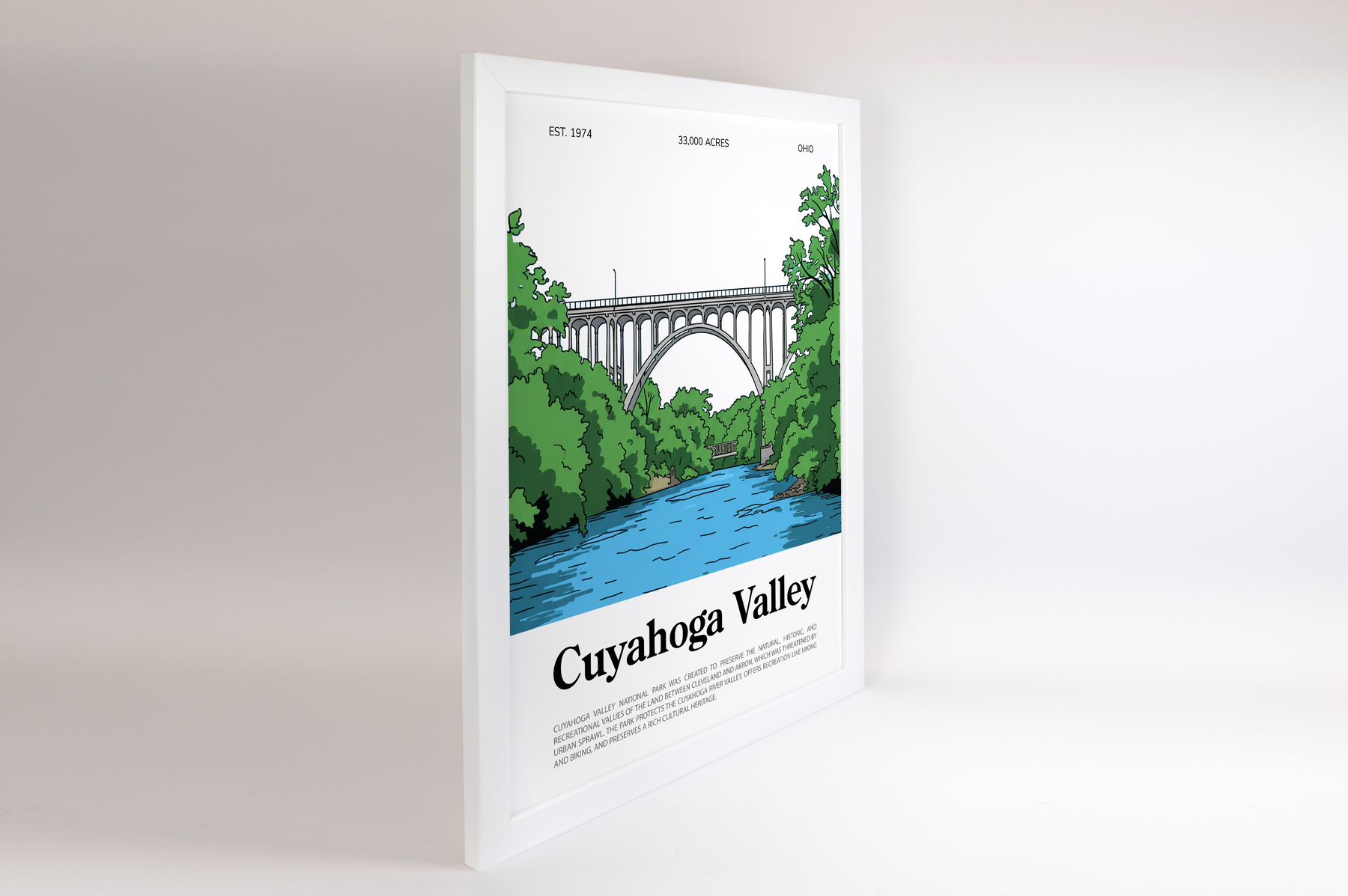 Bring the beauty of Cuyahoga Valley National Park into your space with a bold, minimal, animated-style print. Every line and curve is designed to move and inspire—highlighting the park’s rolling hills, winding trails, and lush forests in a modern, statement-worthy design. This isn’t just art; it’s a tribute to nature’s tranquility.