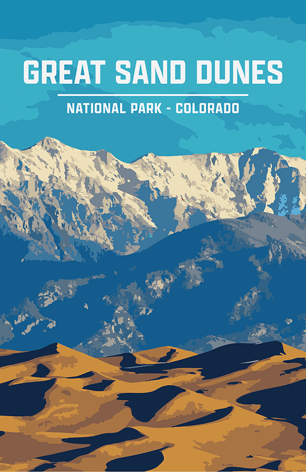 Whether you’ve climbed to the top of Star Dune, splashed through Medano Creek, or camped under a sky filled with stars and silence, this poster commemorates your journey and connection to the ever-shifting beauty of Great Sand Dunes National Park.