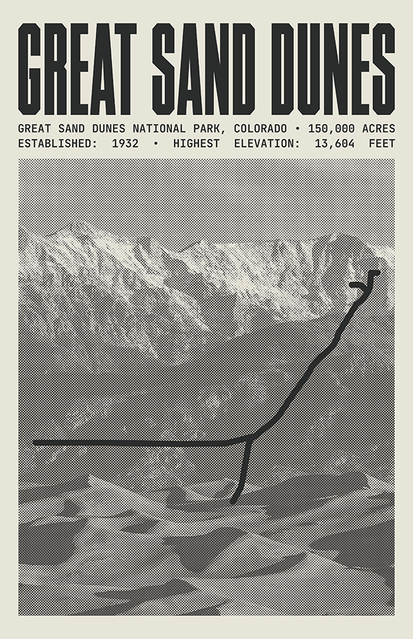 The High Dune Loop Hike Art Prints, provided by Park-Poster, bring to life the mesmerizing beauty of Great Sand Dunes National Park in a way that’s both vivid and immersive. The artwork transports you to the heart of the park, where the towering dunes seem to rise up endlessly, their golden sands shifting with the wind, casting ever-changing shadows across the landscape. Set against the dramatic backdrop of the Sangre de Cristo Mountains, the print captures the sweeping vistas and the profound sense of solitude that the dunes offer. The intricate details of the artwork highlight the natural beauty of this unique terrain—where the vastness of the sand contrasts with the ruggedness of the mountains, creating an awe-inspiring scene that’s both tranquil and untamed. Whether you’ve stood at the top of the High Dune, taking in the incredible view, or dream of experiencing it, these prints serve as a perfect reminder of the park’s wild beauty and the adventure that awaits those who step into this extraordinary desert landscape. The High Dune Loop isn’t just a hike—it’s a journey into a world where time seems to stand still, and every step is a discovery.