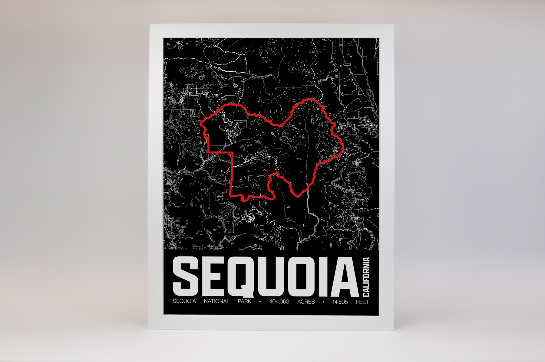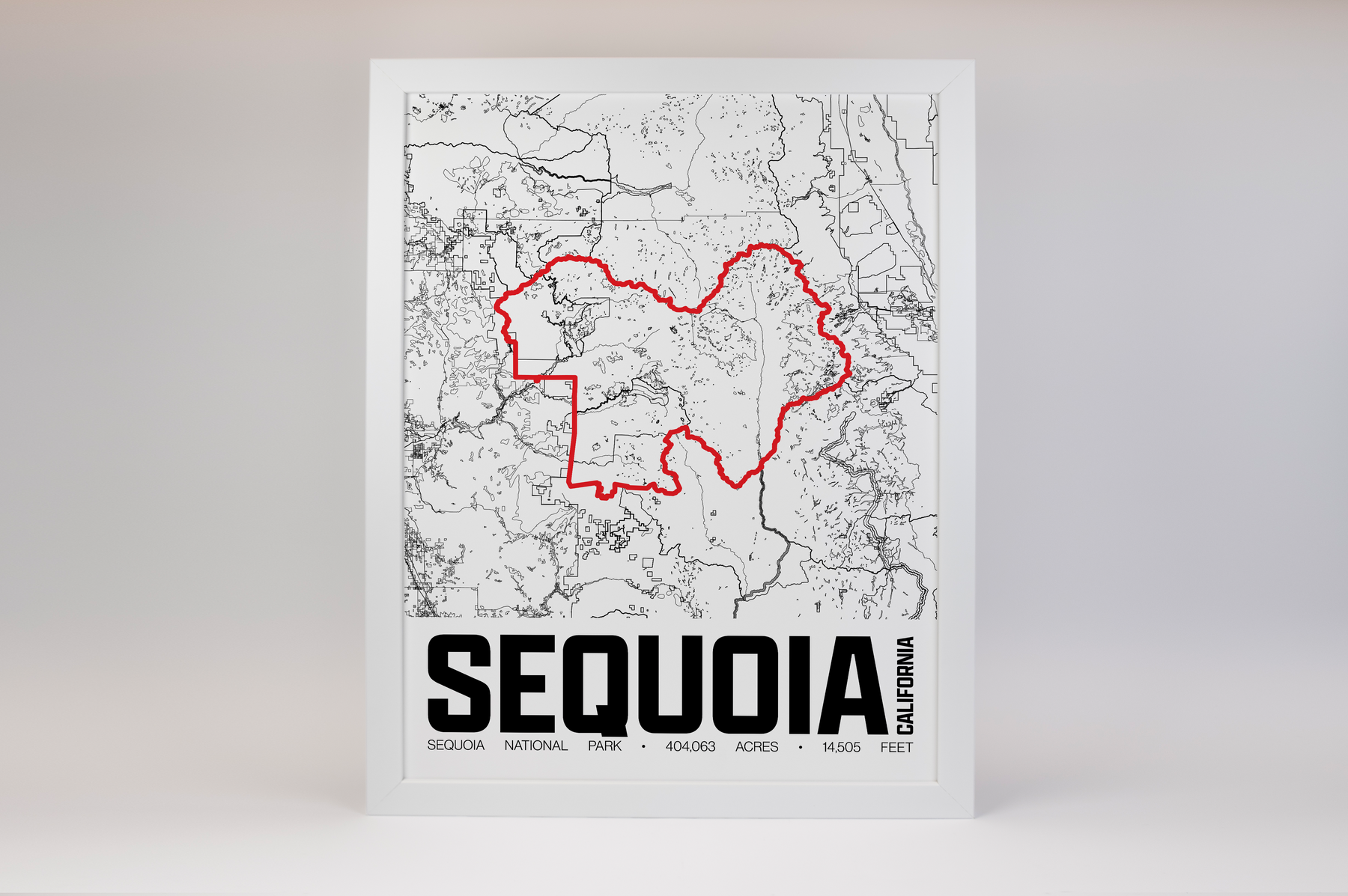 Celebrate your adventure with a bold new take on National Park art. This modern print features the official boundary of Sequoia National Park overlaid on a detailed road and terrain map, capturing the towering groves, granite peaks, and glacial-carved valleys that define the home of the world’s largest trees.